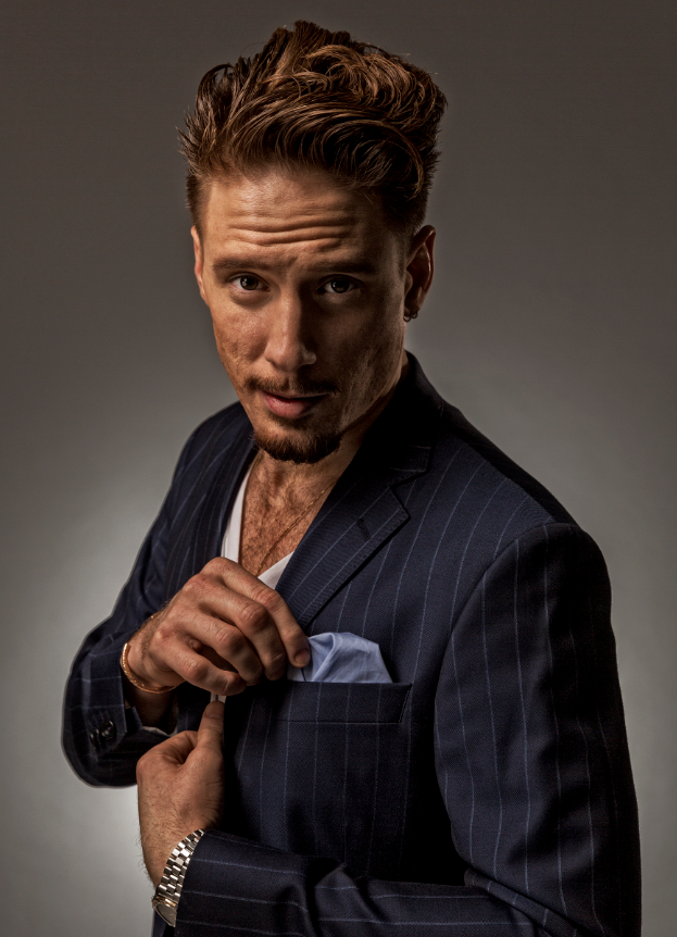 Makeup och hår för glamourfotografering med fotograf Mathilda, modell ”Alex” och barocksoffa